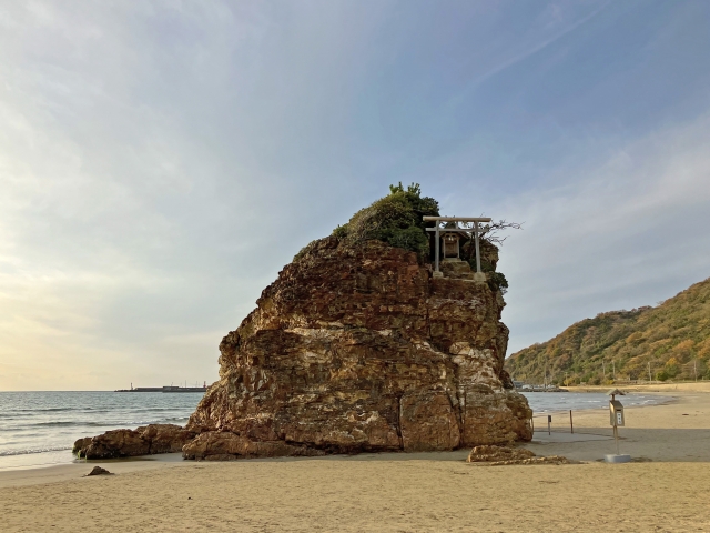 出雲大社から西へ徒歩15分ほどのところにあるのが稲佐の浜(いなさのはま)です。ここは国譲り神話の舞台となった海岸であり、旧暦10月には全国の神々をお迎えする「神迎神事(かみむかえしんじ)」が行われる神聖な場所として知られています。